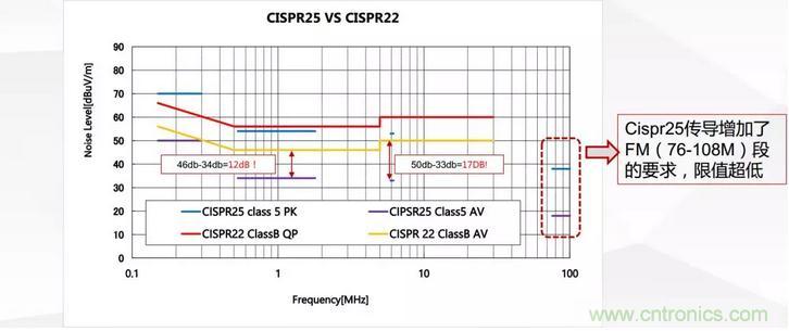 曆史上普遍接受的國際電磁幹擾標準是CISPR-22,美國的電磁幹擾標準是FCC,CISPR-22與FCC有所不同,但一般來說如果電源符合CISPR-22標準,那麼它也符合FCC標準。總之CISPR-22標準已經成為全世界都遵守的基本標準。汽車上的電磁幹擾標準是CISPR-25,相對CISPR22來說CISPR-25標準限製值更低並且額外對FM頻段做了很嚴的限製要求。具體傳導測試限製要求如圖2所示。