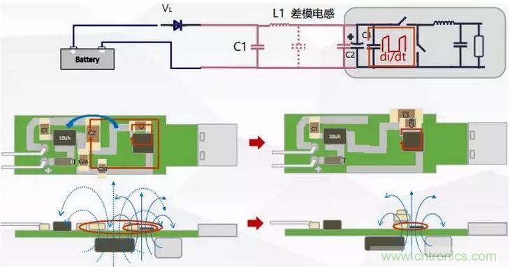 在功率開關回路中di/dt環路會產生磁場,並且磁場強度與電流和環路麵積成正比關係。減小環路麵積能大幅度減小對外輻射。如圖6所示通過將輸入電容C2靠近芯片可以顯著減小磁場輻射程度。