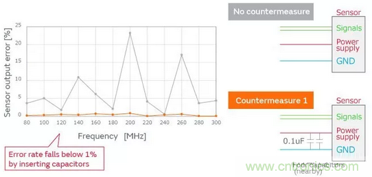 傳感器的電源線受噪聲影響,會發生傳感器輸出值的異常(輸出誤差)。將注入電源線的噪聲級固定,對對策前後的輸出誤差的大小進行調查。