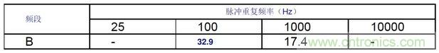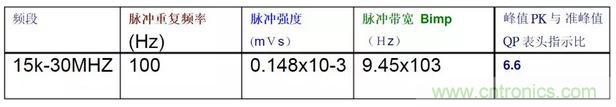 由表可知,峰值測量結果≥準峰值測量結果。下表中中列出了輸入標準脈衝,在標準寬帶情況下峰值與準峰值表頭指示之比值。峰值測量時的絕對脈衝特性