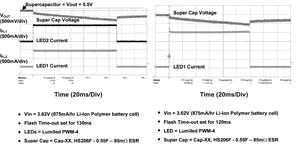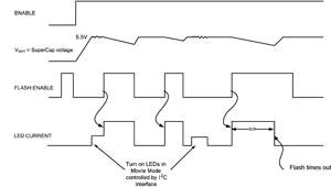 圖3顯示了采用2個以1A電流驅動的LED閃光燈和1個以2A電流驅動的LED閃光燈的測試結果。正如所見到的一樣,超級電容可以很容易地提供閃光持續120ms所需的電流,同時保持電源電壓充分地高於LED的VF電壓。在兩次閃光之間,超級電容以一個較慢的速率再充電,充電時間在外部設定,可針對不同的電池尺寸和化學原理進行優化。圖4顯示了閃光功能和電影模式選項的數字控製。