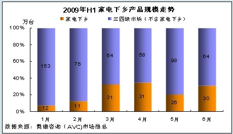 根據奧維谘詢(AVC)對家電下鄉市場的監測以及對全國市場零售規模的評估,2009年1-6月份彩電下鄉零售規模為141.09萬台,占三四級市場的總量的21.54%。