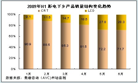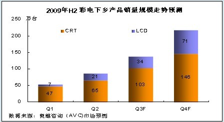 根據奧維谘詢(AVC)對三四級以及農村市場的理解和研究,結合下半年彩電業形勢,我們認為:隨著各省對家電下鄉工作的進一步開展以及彩電市場傳統旺季的到來,2009年第三、四季度,彩電下鄉規模將繼續保持較快速度增長,同時LCD產品的比重也將進一步增加,到第四季度,LCD產品銷量比重將占彩電下鄉市場的三分之一,銷售額比重將突破50%。