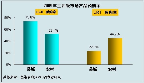 奧維谘詢(AVC)對主要下鄉省份的三四級市場研究結果顯示,在有計劃於2009年購買彩電產品的人群中,他們更傾向於購買LCD產品,;而即使在農村市場,CRT產品的預購率仍要低於LCD產品,扣除消費者購買能力因素,LCD在農村市場的被接受程度仍然較高。