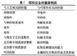 weidianzilingyushiyongdehanliaoyouzhehenyangedexingnengyaoqiu,wuqianhanliaoyebuliwai,bujinbaokuodianxuehelixuexingneng,haibixujuyoulixiangderongrongwendu。congzhizaogongyihekekaoxingliangfangmiankaolv,biao1列出了焊料合金的一些重要性能。
