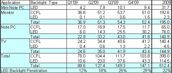 DisplaySearch估計2009年第三季大尺寸 LED背光源麵板出貨將達3千760萬片,占所有大尺寸液晶麵板的25%。從下表二可知,2009年全年LED背光源麵板出貨預估達1億1千500萬片,滲透率為22%;同時LED背光源麵板的滲透率將從2009年第一季的12%於第四季快速成長到29%。