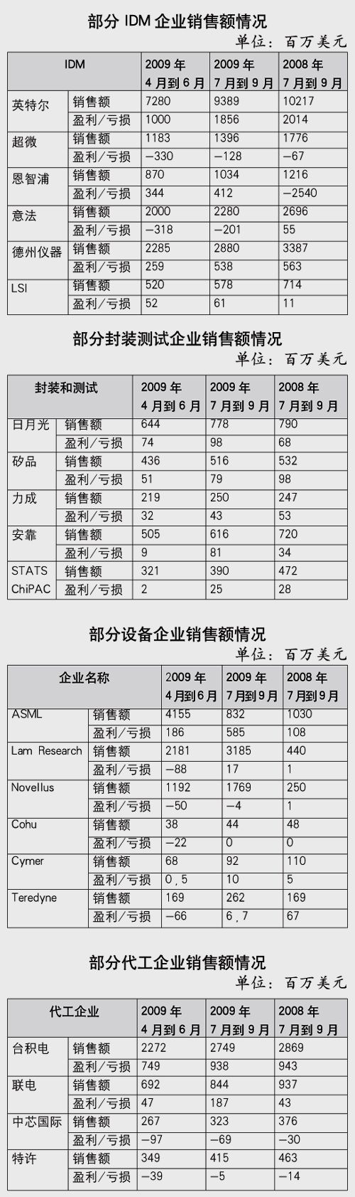 國際金融危機重創半導體業。今年第一季度企業產能利用率普遍在50%以(yi)下(xia)。進(jin)入(ru)第(di)二(er)季(ji)度(du)後(hou),我(wo)們(men)看(kan)到(dao)部(bu)分(fen)企(qi)業(ye)業(ye)務(wu)止(zhi)跌(die)回(hui)升(sheng)。近(jin)日(ri),企(qi)業(ye)第(di)三(san)季(ji)度(du)財(cai)報(bao)紛(fen)紛(fen)出(chu)籠(long),產(chan)業(ye)好(hao)轉(zhuan)趨(qu)勢(shi)進(jin)一(yi)步(bu)明(ming)朗(lang)化(hua)。但(dan)由(you)於(yu)企(qi)業(ye)上(shang)升(sheng)動(dong)力(li)不(bu)足(zu),產(chan)業(ye)出(chu)現(xian)“V型”反彈的可能性不大,應該會在振蕩中上升。與此同時,今年半導體業銷售額同比下降約15%的狀況已確定無疑。業內目前關注明年產業上升的幅度。