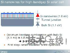 IMEC的目標是實現在矽底板上形成矽納米線的太陽能電池。矽底板的帶隙為1.1eV,而利用量子效應的矽納米線為1.7~1.8eV。組合帶隙不同的矽底板和矽納米線,可期待提高效率。Poortmans表示:“如果這一設想能夠實現,轉換效率將達到約33%”。