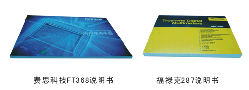 福祿克287裏一個塑料袋也沒有,估計是本著環保理念,可是16國語言說明書厚厚一本,有用的隻有1/16,看來理念不統一,但你可用來學語言。費思FT368手冊是中文,編寫很細很專業。