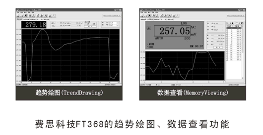 費思FT368拍馬挑戰,更是挾係列高級功能重裝上陣,其標配的高速數據接口和FaithtechView測試包可實現5項高級功能:趨勢繪圖,數據記錄分析,邏輯分析,單通道示波,諧波分析。費思FT368的高級功能充分享受了IT技術發展的成果(PC機的能力太強大), 其趨勢繪圖和數據記錄分析的功能多樣性、數據豐富性、圖形可視性、操作實用性等方麵和福祿克287相比已經不在一個級別,當然費思FT368使用這些功能必須外接一台PC機。