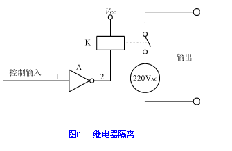 繼電器是常用的數字輸出隔離元件,用繼電器作為隔離元件簡單實用,價格低廉。圖6是(shi)繼(ji)電(dian)器(qi)輸(shu)出(chu)隔(ge)離(li)的(de)實(shi)例(li)示(shi)意(yi)圖(tu)。在(zai)該(gai)電(dian)路(lu)中(zhong),通(tong)過(guo)繼(ji)電(dian)器(qi)把(ba)低(di)壓(ya)直(zhi)流(liu)與(yu)高(gao)壓(ya)交(jiao)流(liu)隔(ge)離(li)開(kai)來(lai),使(shi)高(gao)壓(ya)交(jiao)流(liu)側(ce)的(de)幹(gan)擾(rao)無(wu)法(fa)進(jin)入(ru)低(di)壓(ya)直(zhi)流(liu)側(ce)。