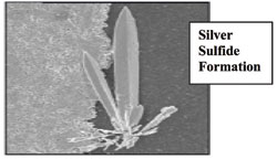 硫(liu)化(hua)銀(yin)是(shi)不(bu)導(dao)電(dian)的(de),而(er)持(chi)續(xu)暴(bao)露(lu)在(zai)硫(liu)環(huan)境(jing)中(zhong)將(jiang)意(yi)味(wei)著(zhe)更(geng)多(duo)硫(liu)化(hua)銀(yin)的(de)形(xing)成(cheng),直(zhi)到(dao)所(suo)有(you)的(de)銀(yin)都(dou)完(wan)全(quan)轉(zhuan)化(hua)成(cheng)硫(liu)化(hua)銀(yin)。導(dao)電(dian)層(ceng)將(jiang)因(yin)此(ci)被(bei)中(zhong)斷(duan),而(er)該(gai)元(yuan)件(jian)將(jiang)變(bian)成(cheng)開(kai)路(lu)。對(dui)任(ren)何(he)汽(qi)車(che)或(huo)工(gong)業(ye)設(she)備(bei)製(zhi)造(zao)商(shang)而(er)言(yan),這(zhe)是(shi)一(yi)種(zhong)特(te)別(bie)令(ling)人(ren)沮(ju)喪(sang)的(de)現(xian)象(xiang),因(yin)為(wei)它(ta)是(shi)一(yi)種(zhong)在(zai)製(zhi)造(zao)時(shi)完(wan)全(quan)無(wu)法(fa)檢(jian)測(ce)的(de)潛(qian)在(zai)故(gu)障(zhang)。有(you)些(xie)汽(qi)車(che)和(he)工(gong)業(ye)設(she)備(bei)製(zhi)造(zao)商(shang)已(yi)經(jing)通(tong)過(guo)密(mi)封(feng)電(dian)子(zi)設(she)備(bei),成(cheng)功(gong)地(di)阻(zu)止(zhi)了(le)硫(liu)化(hua)銀(yin)的(de)形(xing)成(cheng),但(dan)要(yao)將(jiang)該(gai)方(fang)法(fa)應(ying)用(yong)於(yu)所(suo)有(you)情(qing)況(kuang)並(bing)不(bu)可(ke)行(xing),而(er)且(qie)這(zhe)並(bing)不(bu)是(shi)一(yi)種(zhong)能(neng)確(que)保(bao)防(fang)止(zhi)硫(liu)汙(wu)染(ran)的(de)可(ke)靠(kao)方(fang)法(fa)。