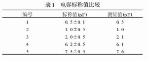 現對5個標稱值已知的片式電容在300M~3000MHz的頻率範圍內測量,所得數據與生產廠家給出的電容標稱值進行比較,如表1所示。