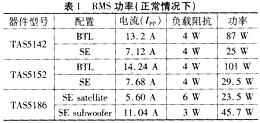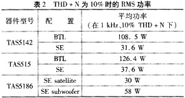 TexasInstruments還提供具有數字增益控製功能的RMS功率測量方式,使THD+N≤10%。利用TI公司的TAS5508或TAS5086型調製器,可以實現數字增益。THD+N為10%時的平均功率要高於正常FTC的THD+N<1%時的額定功率。表2列出了THD+N為10%時的平均功率。