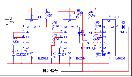 充電電路與脈衝信號結合,對電路進行充電。這裏的脈衝信號可用555定時器來實現,用3個555來構成一個頻率在周期變化的脈衝信號。電路圖如圖。