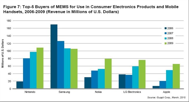據iSuppli公司,日本任天堂在2009年超越韓國的三星,成為用於消費電子產品和手機的微機電係統(MEMS)的全球最大買家。