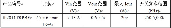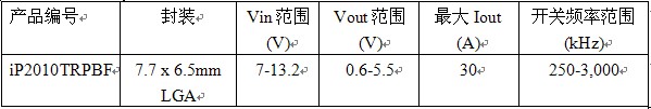 iP2010的輸入電壓範圍為7V至13.2V,輸出電壓範圍則為0.6V至5.5V,輸出電流高達30A。這個器件最高運行頻率為3MHz。在5MHz運行時,與iP2010引腳兼容的iP2011備有相同的輸入和輸出電壓範圍,但後者經過優化,從而使最高輸出電流高達20A。通過以通用占位麵積提供多種電流額定值器件,IR提供的靈活性能夠滿足不同客戶對電流水平、性能和成本的要求。
