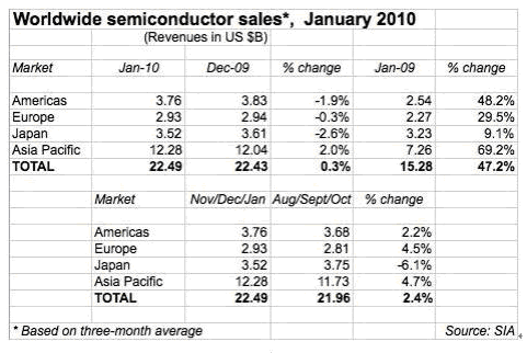 按SIA總裁的看法,全球半導體銷售額1月的最新數據(三個月的移動平均值) 比12月的225億美元上升0,3%,分析推動市場增長在眾多方麵,包括計算機,手機,汽車電子和工業應用。如果與去年同期相比,銷售額增長達47%,顯然與09年1月時正值全球的最低點有關。