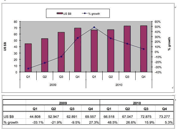 iSuppli的高級副總裁Dale Ford對於1月的數據把它延伸到第1季度來觀察,可能與09年Q4的665億美元相比仍有4,4%的下降。2010年Q1的關鍵市場在無線通訊,(包括手機) 其銷售額為131億美元比去年同期上升53%。存儲器部分的銷售額(DRAM 及NAND閃存) 與去年同期相比可能翻一倍。