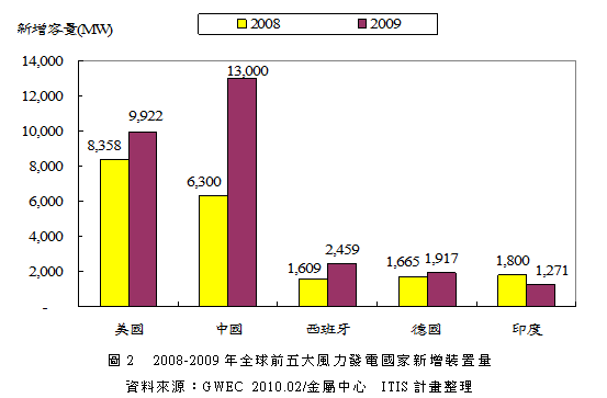 2009年全球風力發電市場不畏金融海嘯衝擊,在美國及中國政府大力推廣下,新增風力發電裝置量仍較2008年成長31%。但因2009年新增容量主要來自既有存貨,風力機接訂單量僅為15,717MW,較2008年衰退41%。前瞻2010年,在中、美及歐洲風電大國帶動下,全球風力發電新增容量將較2009年成長15%;而風力機接單量受到價格驟降及主要風電大國景氣回升影響,可望庫存回補而為2009年的2.2倍。