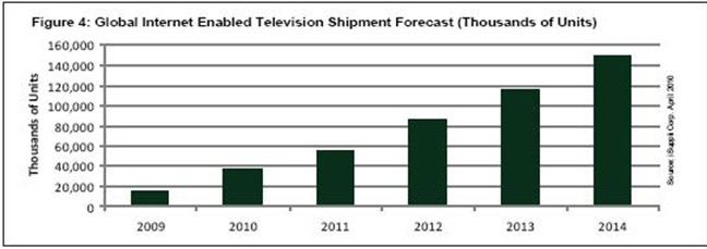 同樣,隨著品牌廠商努力延緩價格下跌速度和吸引消費者來更換其原有的老式平板電視,未來幾年對於IETV的推廣活動將會增強。iSuppli公司預測,2014年IETV市場將從2009年的1470萬台增長到1.49億台,複合年度增長率為58.9%。
