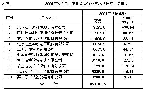 2009年行業前十名主營業務(電子專用設備)銷售收入達到34.7億元,比2008年前十名增長17.32%。江蘇蘇淨集團有限公司2009年主營業務的銷售收入達到9.2億元,增速達到48%,在我行業的主營業務銷售收入中繼續位居首位。