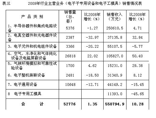 2009年行業主營業務(電子專用設備和電子專用工模具)銷售收入為55.08億元,同比增長了8%。其中,電子專用設備2009年銷售收入同比增長10.28%,增速高於2008年0.28個百分點。除電子元件和機電組件設備、電子通用設備、電子專用工模具負增長外,其它五類電子專用設備的銷售收入都是正增長。淨化設備、光電器件設備和試驗設備的增長速度最快,增長率都接近和超過30%。