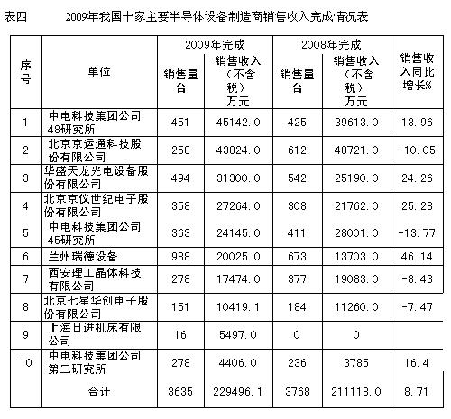 2009年我國十家主要半導體設備製造商完成的半導體設備總銷售收入(不含稅)達到22.95億元,同比增長了8.71%。半導體設備出口交貨值為4127.4萬元,同比下降了31.2%。