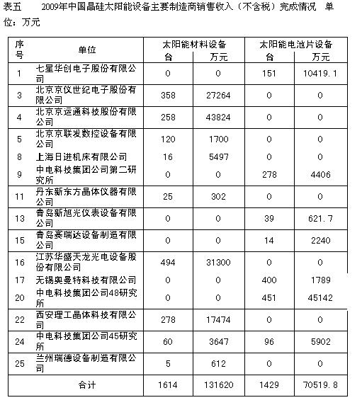 2009年下半年在光伏產業市場的推動下,我國晶矽太陽能設備得到迅速複蘇,2009年我國主要太陽能電池製造商太陽能設備銷售收入比2008年增長了14.44%,達到20.21億元。其中:太陽能級晶矽生長和加工設備增長7.34%,達到13.16億元,占太陽能電池設備銷售收入的65.1﹪(2008年為69.4%);晶矽太陽能電池芯片製造設備增長30.56%,達到7.05億元,占太陽能電池設備銷售收入的34.9﹪。