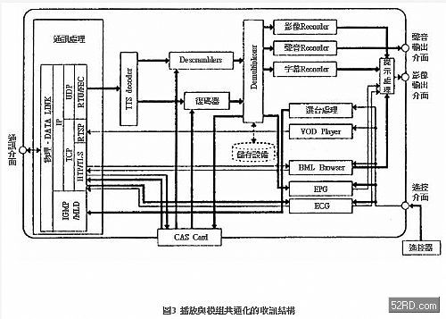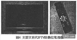 上述整合技術透過終端的共通化,可以實現係統的經濟化要求。圖3是播放與模組共通化的收訊機結構範例;圖4是支援次世代IPTV的數字電視機的實際外觀,它不需要傳統STB就能夠提供IPTV服務。