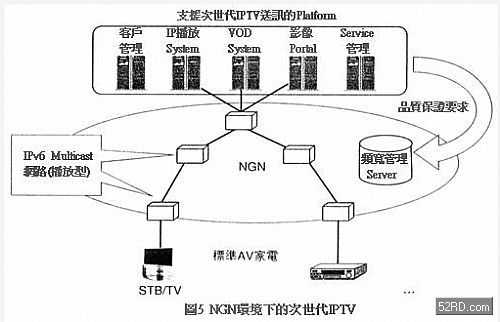 實現次世代IPTV服務必需與可作QoS控製的次世代網路(NGN)整合。如圖5所示NGN與次世代IPTV係統整合,藉此建立次世代IPTV全新服務的要件。