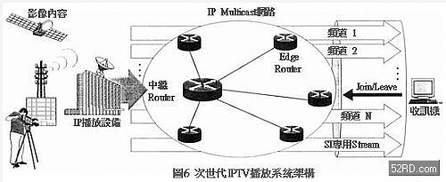 圖6是次世代IPTV播放係統架構,如圖所示IPTV播放係統透過送出設備的IPMulticast傳送節目,收訊機端消費者的選台操作,可以使該傳輸該節目的MulticastStream收訊再生。
