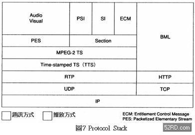 表1是次世代IP電視播放方式的諸元,該方式以標準數字播放為平台,同時追加以IP網路傳送數字播放節目的內容。圖7是IP播放方式的ProtocolStack,如圖所示該ProtocolStack與數位播放一樣,可以利用TS(TransportStream)使多重化Stream收容在Multicast內。