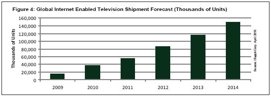 同樣,隨著品牌廠商努力延緩價格下跌速度和吸引消費者來更換其原有的老式平板電視,未來幾年對於IETV的推廣活動將會增強。iSuppli公司預測,2014年IETV市場將從2009年的1470萬台增長到1.49億台,複合年度增長率為58.9%。