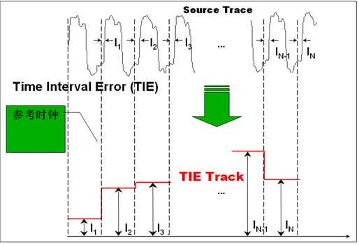 TIE又稱為phase jitter,是信號在電平轉換時,其邊沿與理想時間位置的偏移量。理想時間位置可以從待測試時鍾中恢複,或來自於其他參考時鍾。如圖2所示TIE抖動的示意圖,I1、I2、I3、In-1、In是時鍾第一個到第n個上升沿與理想時間位置的偏差,將I1、I2到In進行數理統計,在所有樣本的找出最大值和最小值,兩者相減可以得到TIE抖動的峰峰值,即: