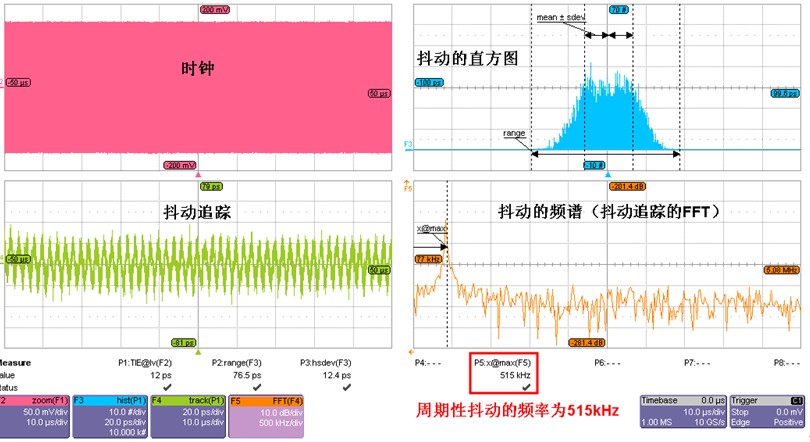 左下角的F4為TIE track(即TIE抖動隨時間變化的趨勢),從TIE Track中可以看到周期性的變化趨勢;右下角的F5是F4的FFT運算,即抖動的頻譜,頻譜的峰值頻率為515kHz,說明該時鍾的周期性抖動(PJ)的主要來源為515kHz,找到頻點後,可以查找電路板上主頻或諧波為該頻率的芯片和PCB走線,進一步調試與分析。時鍾抖動的分解