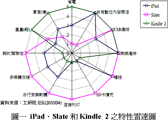 工研院IEK進行iPad、Slate和Kindle 2三種產品有關省電、自有數位內容商店、USB連結、無線連結、觸控、SD卡擴充、直接列印、自行安裝軟體、多媒體支援、與PC關聯性、重量(輕)和厚度(薄)等特性的競比,1分代表不具有其特性,為最低比重,分數越高代表與此特性關聯性越強,完全相關聯為最高5分,將其結果繪製成雷達圖(圖一)表示。