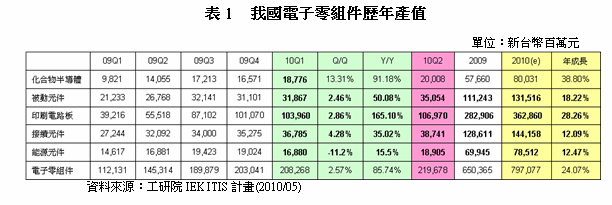 - 預估2010年第二季我國電子零組件產值將達新台幣2,197億元