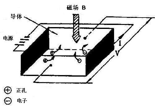 在平板半導體介質中,電子移動(有電場)的方向,將因磁力的作用(有磁場),而改變電子行進的方向。若電場與磁場互相垂直時,其傳導的載子(電子或電洞),將集中於平板的上下兩邊,因而形成電位差存在的現象。該電位差即霍爾電壓(霍爾電壓)在實際的霍爾組件中,一般使用物質中之電流載子為電子的N型半導體材料。將一定之輸入施加至霍爾組件時之輸出電壓,利用上述之關係予以分析時,可以獲致下列的結論: