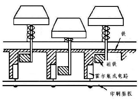 霍爾集成電路通常使用於前述磁電變換組件的項所述的(A-1)、(A-2)範圍的用途,在這些用途的中,特別像開關那樣,以磁氣為媒介將位置的變化、速度、回轉等的物理量變換為電氣量時,使用起來非常簡單。使用霍爾集成電路的開關係如圖2-21所示,這種開關具有:(1)無震動(Chattering),(2)不生雜音,(3)使用壽命長,可靠度高,(4)響應速度快等特征,已經實際被使用作為高級的鍵盤用開關。