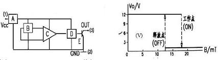 圖11是A44E集成霍耳開關,A44E集成霍耳開關由穩壓器A、霍耳電勢發生器(即矽霍耳片)(mT)、差分放大器C、施密特觸發器D和OC門輸出E五個基本部分組成,如圖12(a)所示。(1)、(2)、(3)代表集成霍耳開關的三個引出端點。在輸入端輸入電壓VCC,經(jing)穩(wen)壓(ya)器(qi)穩(wen)壓(ya)後(hou)加(jia)在(zai)霍(huo)耳(er)電(dian)勢(shi)發(fa)生(sheng)器(qi)的(de)兩(liang)端(duan),根(gen)據(ju)霍(huo)耳(er)效(xiao)應(ying)原(yuan)理(li),當(dang)霍(huo)耳(er)片(pian)處(chu)在(zai)磁(ci)場(chang)中(zhong)時(shi),在(zai)垂(chui)直(zhi)於(yu)磁(ci)場(chang)的(de)方(fang)向(xiang)通(tong)以(yi)電(dian)流(liu),則(ze)與(yu)這(zhe)二(er)者(zhe)相(xiang)垂(chui)直(zhi)的(de)方(fang)向(xiang)上(shang)將(jiang)會(hui)產(chan)生(sheng)霍(huo)耳(er)電(dian)勢(shi)差(cha)HV輸出,該HV信號經放大器放大後送至施密特觸發器整形,使其成為方波輸送到OC門輸出。