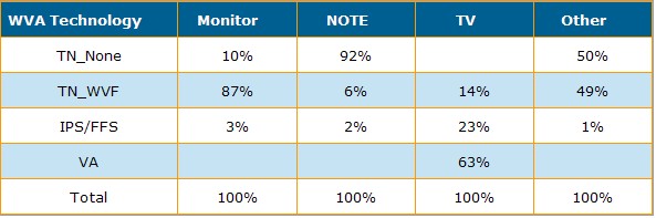 在 Quarterly Wide Viewing Angle Technology Report, (DisplaySearch季度廣視角技術出貨報告) 中,DisplaySearch 追蹤了各麵板廠商在不同視角技術麵板的出貨應用與出貨尺寸。LG Display是TN型出貨的全球領先,2010年第一季TN麵積市占率達到29%,三星以及新奇美(Chimei Innolux)則在TN-WVF (TN加廣視角膜)的市占率並駕齊驅,都達到22%。另外以IPS/FFS而言,LG Display以88%的麵積市占率領先,VA出貨則由三星以39%的麵積市占率領先。