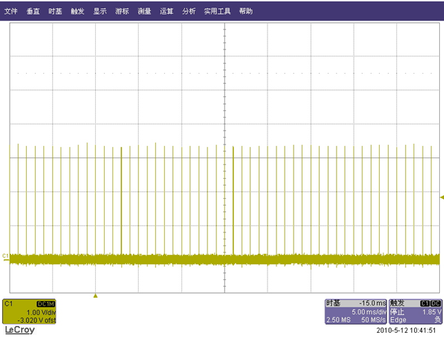 而且這個“飛鳥”和林中的“鳥”相比較很多特點差不多,用什麼邊沿、脈寬、邏輯等觸發還拿它沒辦法;正一籌莫展之際,仔細觀察圖二,終於找到這個“飛鳥”的弱點,正常的波形沒過衝,而數據量突發增大的波形有,不過它跟我們經常見到的出現在波形上方的過衝有點差別(而我們往往習慣於在0軸上方找觸發點、設置觸發電平),它出現在0軸的下麵,正因為這點差點讓它“飛”走了,弱點找到就好辦了,我們把觸發電平設置在0軸下麵的過衝上,並按下normal或single的觸發模式,“鳥兒”很容易就抓到了: