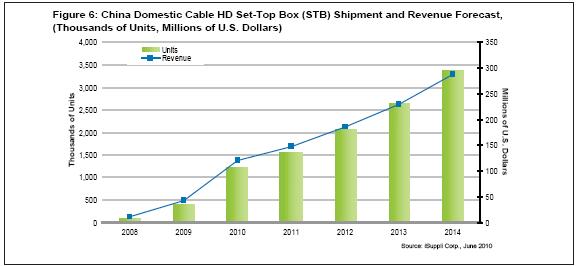 盡jin管guan預yu計ji高gao清qing機ji頂ding盒he市shi場chang將jiang快kuai速su增zeng長chang,但dan由you於yu缺que乏fa高gao清qing內nei容rong,所suo有you的de有you線xian運yun營ying商shang都dou在zai提ti高gao營ying業ye收shou入ru和he利li潤run方fang麵mian遇yu到dao挑tiao戰zhan。目mu前qian運yun營ying商shang僅jin提ti供gong大da約yue10個高清節目頻道。因此,iSuppli公司認為,中國國內有線高清領域在2010和2011年仍將是機頂盒的利基市場。