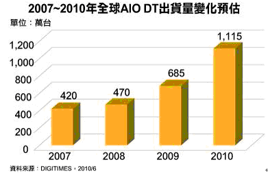 平價一體式桌上型計算機(All In One PC;AIO PC)在2009年創下685萬台,成長45.7%後,DIGITIMES Research預估2010年將進一步提高至1,115萬台,成長62.8%,展現新興產品的強勁成長力道。