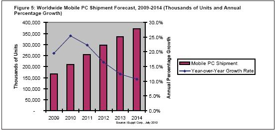 2009年全球移動PC出貨量增長19.6%至1.669億台,到2014年將增長一倍以上,達到3.715億台。