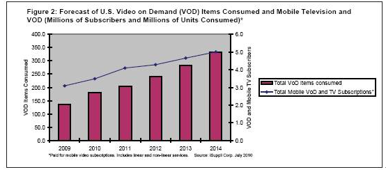 2010年美國移動視頻點播(VOD)和移動電視活躍用戶預計增長到350萬個,2009年是310萬個。隨後幾年用戶數量預計繼續增長,到2014年達到500萬個。