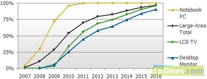 圖一:2007-2016 LED背光源麵板在10寸以上液晶麵板滲透率(按不同應用別)