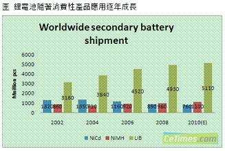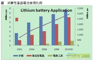 消費性產品的發展趨勢迅速牽動電池產業,根據集邦科技(TrendForce)旗下研究部門EnergyTrend表示,鋰電池隨著量產數量增加,價格與性能也逐漸為消費者所接受,包括手機電池與NB電(dian)池(chi),也(ye)以(yi)鋰(li)電(dian)池(chi)為(wei)使(shi)用(yong)主(zhu)流(liu),而(er)伴(ban)隨(sui)著(zhe)新(xin)材(cai)料(liao)的(de)革(ge)新(xin),動(dong)力(li)鋰(li)電(dian)池(chi)也(ye)成(cheng)功(gong)在(zai)電(dian)動(dong)工(gong)具(ju)以(yi)及(ji)兩(liang)輪(lun)車(che)輛(liang)上(shang)展(zhan)露(lu)頭(tou)角(jiao),讓(rang)鋰(li)電(dian)池(chi)突(tu)破(po)僅(jin)有(you)消(xiao)費(fei)性(xing)產(chan)品(pin)的(de)應(ying)用(yong)局(ju)限(xian)。