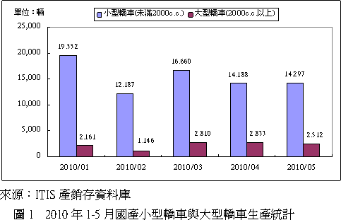 觀察1-5月國產小型轎車與大型轎車生產情形(圖1),小型轎車1月份的產量遠高於其他月份,乃部分產量對應2009年貨物稅減徵期間尚未消化的訂單,另外2月份較少的生產日數造成整車產量為各月中最低者,特別是大型轎車的部分。 相較於2010年第一季,預估第二季整車總產值衰退1.28%,小型轎車產值衰退8.5%,而大型轎車產值則有36.2%的成長。